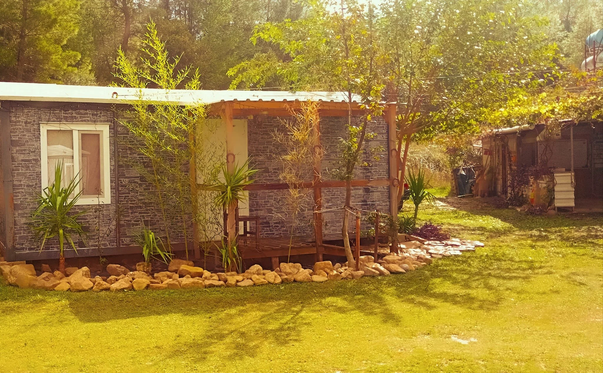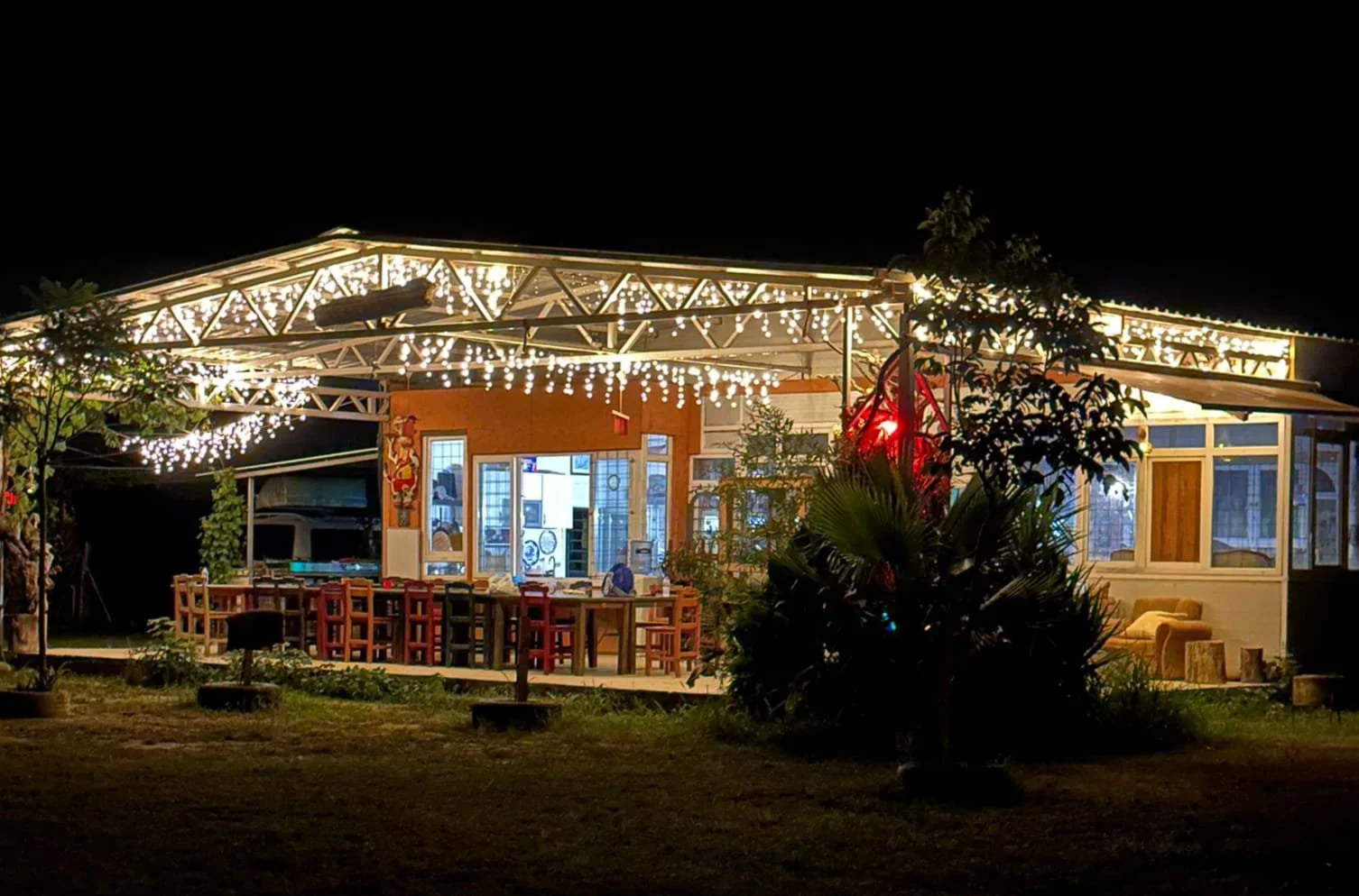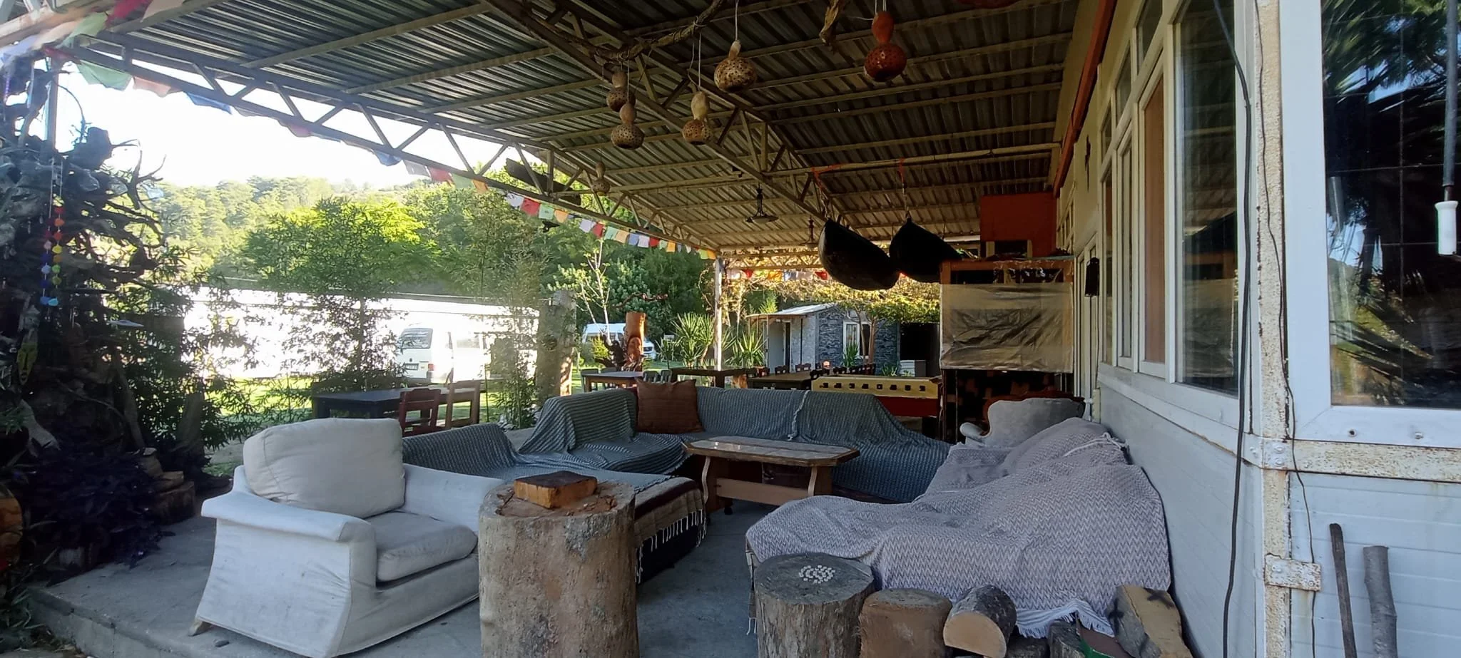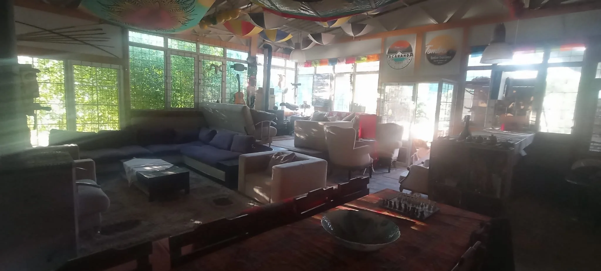 Our eco friendly lodge has a 200m² cosy living room with 2 wood heaters , cosy sitting areas in and outside , outdoor projection cinema, karaoke system, wifi , chill corner, library, games, covered outdoor dining, campfire circle, shaded hammocks corner, swimming place with jumping platform, football \ volley \ basket ball field, archery & air riffle shooting range.